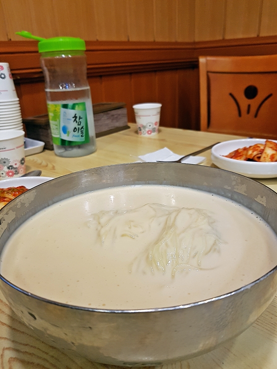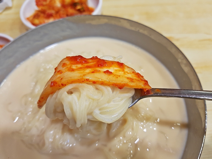 콩국수를 먹다가 맛의 변화를 주려면 이렇게 김치를 위에 올려 먹어도 좋다. 김치와 콩국수가 굉장히 잘 어울린다. 김치를 콩물에 넣어 먹어도 되지만, 그렇게 먹으면 콩물 맛이 변하기 때문에 나는 수저 위에 올려 먹는 편을 선호한다. 아아, 정말 끊을 수가 없는 맛이다. 여름에 먹는 평양냉면도 굉장히 좋은 선택이지만 이 콩국수는 평양냉면과 다른 매력이 있다. 어느 것이 낫다고 말할 수는 없고 취향에 따라서 평양냉면을 먹어도 좋고, 콩국수를 먹어도 된다.