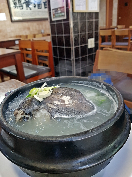 짝꿍의 오골계탕. 앞서 언급한 것처럼 검정색 살이 특징이다. 이런 아름다운 모습은 계속 찍어야지. 음식 사진을 찍을 때마다 참 행복하다. 이 행복을 유지하기 위해 열심히 일해서 열심히 돈 벌고 계속 맛있는 것을 먹어야지.