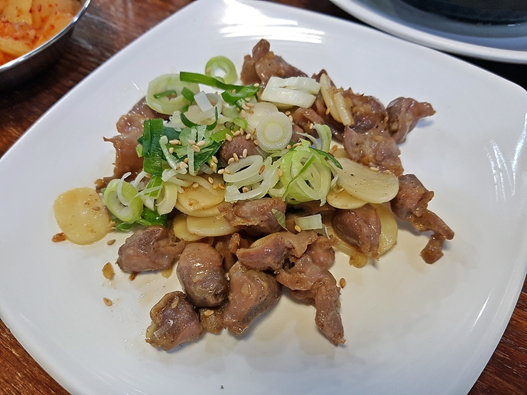 서비스로 받은 닭똥집 볶음. 닭똥집은 모래주머니를 말하는 것으로 흔히 닭근위라고도 표현을 한다. 쫄깃함과 아삭함을 동시에 느낄 수 있는 부위다. 오래 씹으면 고소한 맛을 느낄 수 있다. 닭똥집은 신선하지 않으면 특유의 역한 냄새가 나고 아삭거리는 식감이 사라지는 부위이다. 백제 삼계탕의 닭똥집 볶음은 신선한 것을 사용하고, 과하지 않게 볶아서 닭똥집 특유의 식감과 맛을 정말 잘 느낄 수 있었다. 굉장히 만족스러웠다. 명동에서 맛있는 삼계탕을 먹고 싶다면 꼭 한 번 가볼 것을 강력하게 추천하는 곳이다.