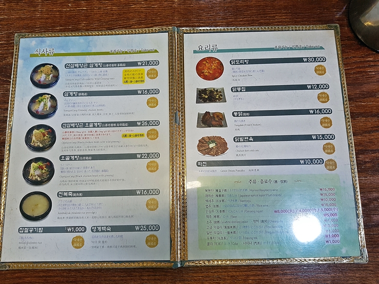 메뉴판. 나는 삼계탕을 주문하고, 짝꿍은 오골계탕을 주문했다. 짝꿍이 오골계를 한 번도 안 먹어봤다고 했다. 아니, 이 맛있는 것을 왜 안 먹어본 것이지. 오골계는 깃털, 살, 벼슬과 부리 등이 전부 검정색이라서 붙여진 이름이다. 일반적인 닭보다 맛이 더 좋다고 알려져 있다. 실제로도 닭보다 더 쫄깃하고 담백한 맛이 난다.