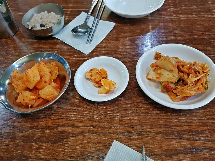 반찬. 깍두기, 마늘 장아찌와 김치가 나온다. 김치와 마늘 장아찌가 참 맛이 좋았다. 마늘 장아찌는 일부러 찾아 먹지는 않지만 있으면 계속 먹게 되는 매력이 있다.