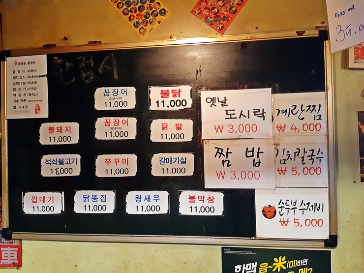 메뉴. 파란 글씨로 적혀있는 것은 안 맵고, 빨간 글씨로 적혀있는 것은 맵다고 한다. 공평동 꼼장어의 시그니처 메뉴라고 할 수 있는 꼼장어를 소금과 양념구이로 각 1인분씩 주문하고, 양념이 제법 맵다고 해서 계란찜도 하나 추가했다.