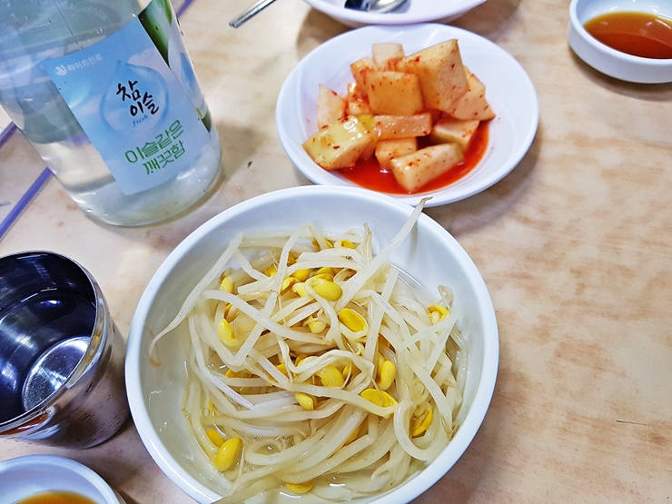 기본찬. 매운 맛을 중화 시키는 콩나물과 깍두기. 콩나물은 그냥 먹어도 되고 닭볶음탕에 넣어 먹어도 된다고 하는데 따로 먹는 편이 닭볶음탕을 더욱 맛있게 먹을 수 있다고 한다. 그렇다면 잠자코 따로 먹어야지.
