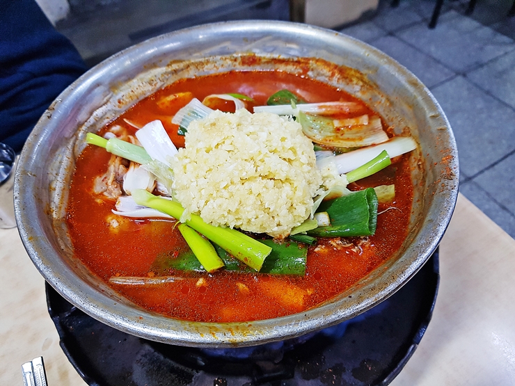 닭볶음탕. 착석 후 얼마 지나지 않아 빠르게 나온다. 명성에 맞는 어마어마한 마늘이 들어있다. 처음 보면 굉장히 알싸하고 매워 보이지만 마늘이 끓이면 끓일수록 알싸한 맛은 사라지고 마늘 특유의 단 맛과 진한 맛을 같이 느낄 수 있다. 열심히 끓여준다. 이대로 바로 먹어도 큰 무리는 없지만 마늘의 알싸한 맛이 강하게 느껴지기 때문에 어느 정도 끓인 후 천천히 떡부터 먹는 것이 좋다.