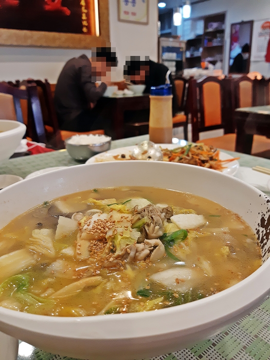 굴짬뽕밥. 굴짬뽕밥은 굴짬뽕보다 500원 비싼데 면이 빠진 대신 채소와 굴 양이 늘어난다고 한다. 면은 쉽게 불기 때문에 술과 함께 즐길 때는 면이 들어간 것보다 밥이 따로 나오는 것이 좋다. 양이 상당하다. 둘이서 술안주로 먹기에도 충분한 양이다. 괜히 친구와 내 것 두 개를 주문했구나. 굴짬뽕이라는 이름답게 굴이 많이 들어있고 채소도 아삭한 맛을 잘 간직하고 있었다. 짬뽕 국물은 시원하면서 살짝 칼칼하다. 마냥 시원하고 담백한 맛일 거라 예상했는데 기분 좋게 허를 찔리는 느낌이 들어 좋았다. 굴짬뽕에 대한 조예가 그리 깊지 않지만 지금까지 먹어본 굴짬뽕들과 비교를 해보면 한 단계 수준이 높다고 자신있게 말할 수 있다. 원조는 괜히 원조가 아니라는 것을 느꼈다.