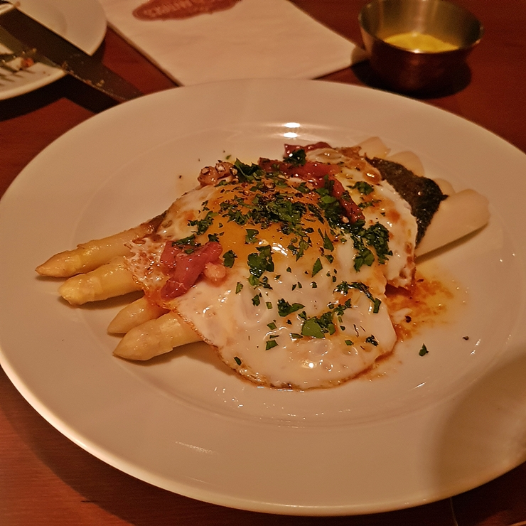 블랙 트러플 크러스트를 곁들인 아스파라거스. 반숙으로 잘 구운 계란 후라이가 함께 제공된다. 후라이 밑에는 삼겹살이 살포시 숨어있다. 삼겹살, 아스파라거스, 계란 후라이와 트러플의 조합은 단단히 반칙인 환상적인 조합이다. 개별로 먹어도 맛있는데 이렇게 잘 조합이 되니 더욱 맛있어지는 것은 더 말할 필요가 없다.