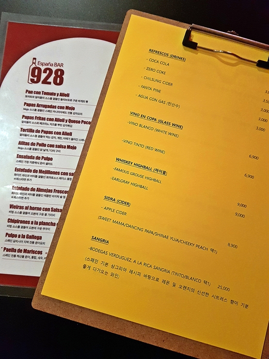 메뉴. 다양한 스페인 요리와 함께 음료, 와인, 하이볼과 애플 소다 등을 판매하고 있다. 가격도 높지 않아 접근성도 좋다. 한국에서 스페인 요리는 마이너한 축에 속하기 때문에 우리는 최대한 다양한 메뉴를 먹어 보기로 했다.