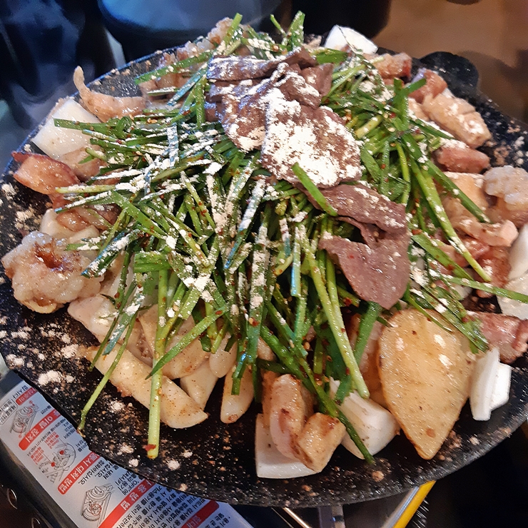 모둠 곱창+특양 추가. 언제봐도 정말 아름다운 모습이다. 곱창, 대창, 막창, 염통과 특양이 들어가고 양파, 떡, 감자와 부추가 잔뜩 올라져있다. 근데 사진이 왜 이렇게 흔들렸지. 찍을 때는 잘 찍었다고 생각했는데 나의 수전증은 정말 예상치 못하게 나온다. 곱의 곱창은 초벌이 아니라 전부 익힌 후 나오기 때문에 바로 먹을 수 있는 장점이 있다. 그래서 한 번 뒤적인 후 냠냠. 특양을 추가 주문해서 그런지 아니면 예전에 비해 양이 줄었는지 상당히 양이 많게 느껴졌다. 최고의 수준이라고 할 수는 없지만 평균 이상의 수준을 보여주는 곱창이다. 이런 곱창을 마주하면 술이 끊임없이 들어가는 마법이 나오기도 한다.