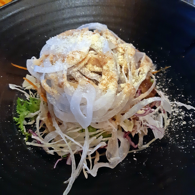 우삼겹 샐러드. 우삼겹, 양파, 양배추 등으로 만들었다. 곱창이 나오기 전, 술 한 잔 하며 먹기 딱 좋다. 예전에는 리필이 됐는데 지금은 물가가 올라서 리필은 안 되고 유료 주문을 해야 한다고 한다.