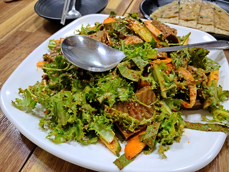 도토리묵 무침. 묵이 상당히 쫀득하고 맛이 진하다. 기성품과 비교할 수 없는 진한 맛이다. 직접 묵을 만든다고 하는데 수제여서 그런지 이런 진한 맛이 나는 것 같다. 쫀득하고 고소한 묵과 새콤한 채소무침이 조합은 전통적이지만 참 맛있는 조합이 아닐 수 없다. 도토리묵 무침을 먹고 있으니 막걸리 한 잔 하고 싶었지만 꾹 참았다.