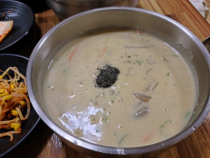 도토리 임자탕. 도토리를 이용해서 만든 수제비이다. 들깨 가루를 많이 풀어서 그런지 상당히 진하고 걸쭉한 맛이 난다. 그러면서 달달한 맛도 느껴지는데 맛이 익숙하면서도 이색적이다. 분명 어디서 먹어본 것 같으면서도 처음 접해보는 것 같은 기묘한 맛. '대체 어디서 먹어봤을까?' 라는 생각을 하면서 먹으니 어느덧 한 그릇을 다 비우고 말았다. 너 이 녀석, 기묘하면서 맛있구나.
