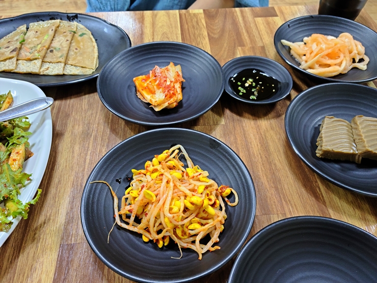 기본 반찬. 도토리전, 묵, 콩나물 무침, 무절임과 김치가 나온다. 도토리전은 단품으로도 판매하는데 이렇게 반찬으로 나오는 것을 봐서는 아마 크기 차이가 있는 것 같다. 상당히 고소하고 맛있었다.
