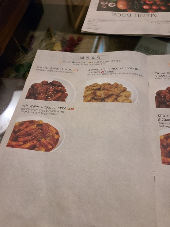 ???? 메인 메뉴에 버젓이 이름을 올린 양념 치킨과 후라이드 치킨. 채식주의자도 치킨은 못 버리는구나 생각을 했는데 자세히 읽어보니 콩고기를 이용해서 만든 가짜 치킨이었다. 오 이런 맙소사. 이러면 치킨이라는 성스러운 이름을 붙이면 안 되는 것이다. 이건 치킨에 대한 모욕이자 조롱이다. 잠시 흥분해서 이성을 잃고 날뛸뻔했지만 마음을 가다듬고 음식을 주문하기로 했다.