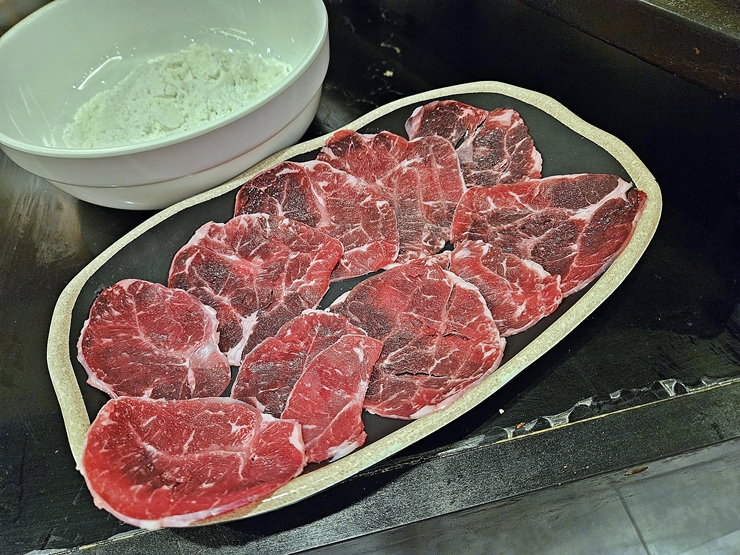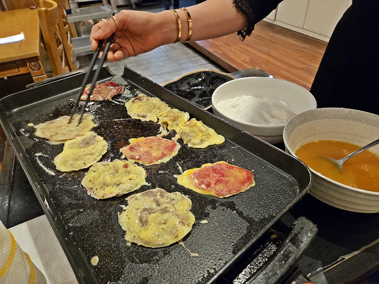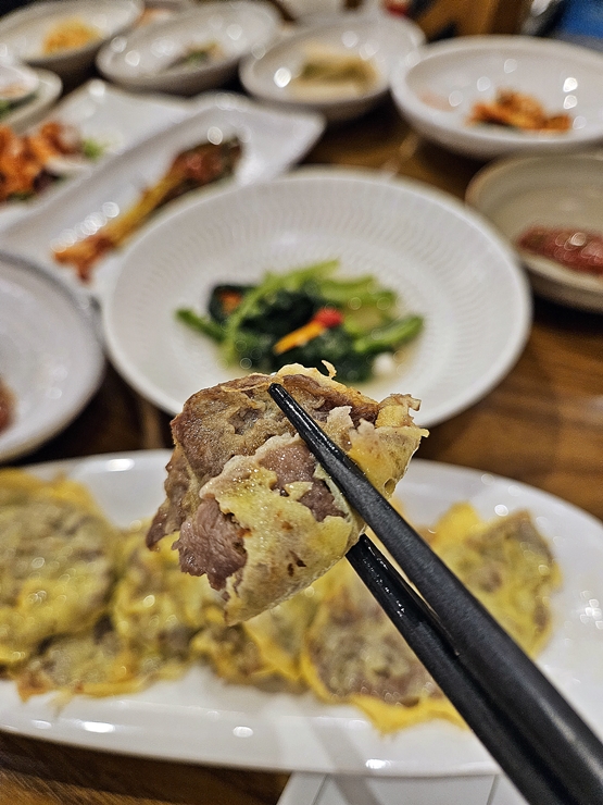 육전은 아롱사태로 만든다. 아롱사태를 얇게 저민 것을 가지고 와서 직접 부쳐주는 것이 특징이다. 가격에 비해 양이 그리 많진 않지만 이렇게 갓 부친 육전을 먹는 것이 나름의 특징이니 그냥 먹어야지. 그리고 내 돈으로 먹은 것이 아니기 때문에 부담 없이 즐길 수 있었다.