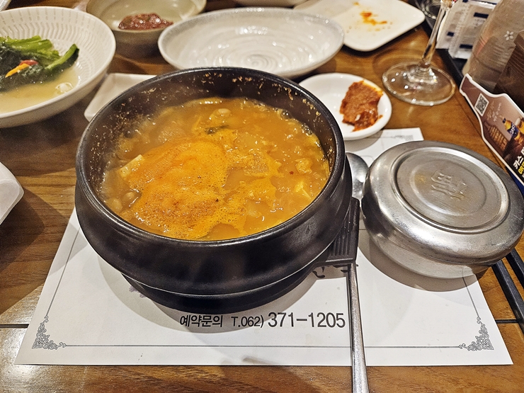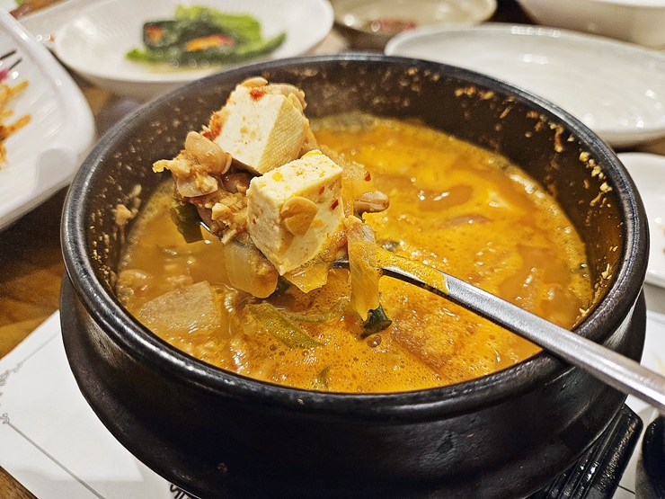 뚝배기 청국장으로 마무리. 말 그대로 큼직한 뚝배기에 청국장이 나온다. 청국장 특유의 냄새가 나지만 절대 거슬리지 않다. 이런 청국장의 고소한 냄새는 식욕을 돋우는 역할을 하기 때문에 전을 많이 먹었음에도 불구하고 끊임 없이 수저를 들게 했다.