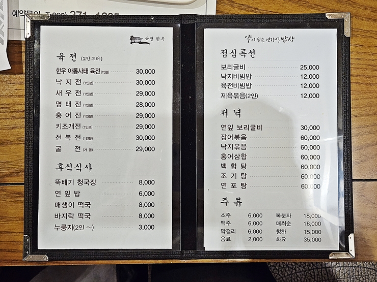 메뉴. 육전, 낙지전, 새우전, 명태전, 홍어전, 키조개전, 전복전과 굴전을 판매하고 있다. 식사로는 청국장, 연잎밥, 매생이 떡국, 바지락 떡국과 누룽지를 판매한다. 그건 그렇고 소주와 맥주가 6,000원이라니 참으로 안타까운 일이 아닐 수 없었다. 이러다가 소주 10,000원의 시대가 올 것 같은 불안한 느낌이 든다.