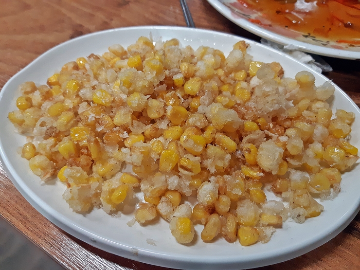 이번에도 서비스로 받은 옥수수 튀김. 옥수수알을 살짝 튀긴 후 설탕을 샤샤샥 뿌린 아주 단순한 요리이다. 이 단순한 요리가 은근히 맛있고 술안주로도 제격이다.
