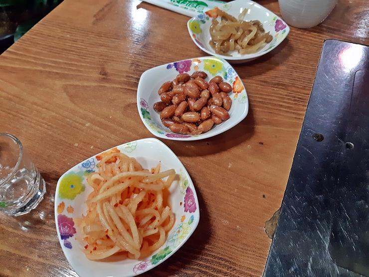 반찬은 지난 번과 똑같다. 짝꿍은 볶은 땅콩을 안주삼아 냠냠. 볶은 땅콩의 간이 적절해서 소주 안주로 제격이었다. 이런 안주가 있으면 소주 한 잔 마시는 것이 인지상정이지.