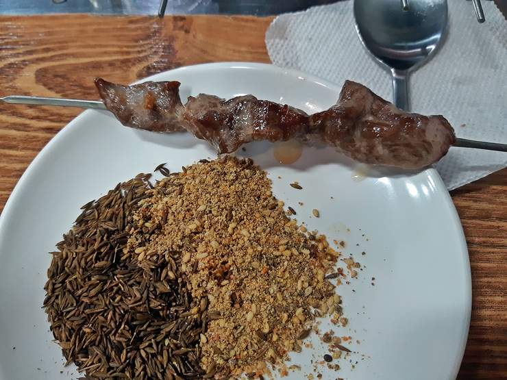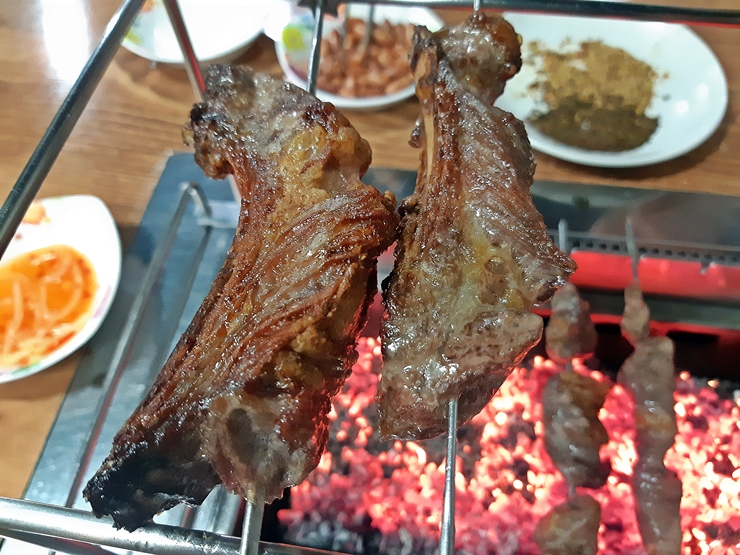 잘 익은 갈빗대. 갈빗대 주위의 살은 정육된 양갈비 꼬치에 비해서 더욱 깊은 맛이 난다. 나쁘게 말하면 양고기 특유의 냄새를 조금은 느낄 수 있다. 그래도 부담스러운 향은 아니기 때문에 나와 짝꿍은 맛있게 냠냠.