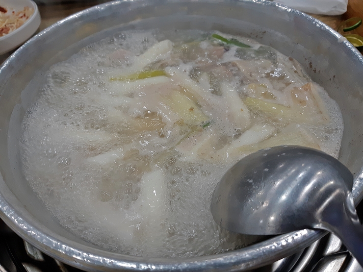 보글보글 잘 끓으면 떡을 건져먹는다. 국물을 먼저 한 모금 마셔봤는데 진옥화할매원조닭한마리보다 상당히 담백하다. 이 담백함이 약간은 호불호가 갈릴 맛이다. 감칠맛이 상대적으로 부족하다 보니 아쉽다고 느낄 수 있는 부분이 충분히 있고 반대로 감칠맛이 적고 담백함이 많아서 만족할만한 부분도 있을 것이다.