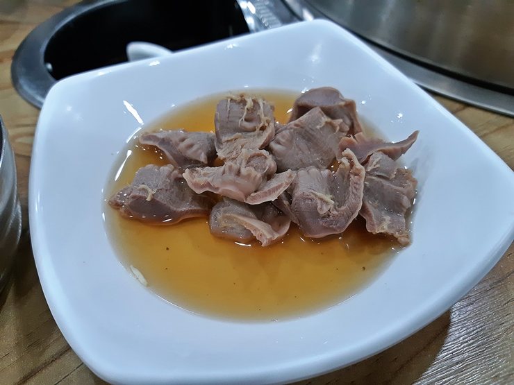 밑반찬으로 나오는 닭근위. 이건 공릉닭한마리만의 특징이라고 한다. 닭근위를 익혀서 연한 간장 소스에 내오는데 간장 소스의 맛은 거의 느껴지지 않았고 잘 익힌 닭근위 맛만 느껴졌다.