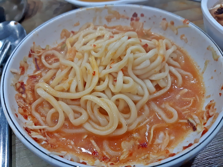 잘 익은 칼국수. 기성품을 사용하기 때문에 칼국수 맛은 평이하다. 진옥화할매원조닭한마리에 비해 담백함이 더한 공릉닭한마리. 감칠맛을 좋아하면 진옥화할매원조닭한마리를 추천하고 담백함을 좋아한다면 공릉닭한마리를 추천한다.