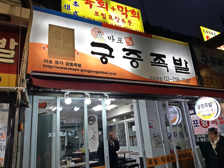 2년만에 만난 대학 동기와 함께 다녀온 공덕역 마포 유가 궁중 족발. 공덕역 족발 골목 바로 앞에 위치해 있어 접근성이 굉장히 뛰어나다. 공덕역 족발 골목에 있는 족발집들은 많이 좁은 편인데, 궁중족발은 비교적 넓게 자리를 차지하고 있어 쾌적하게 먹을 수 있는 장점이 있다.