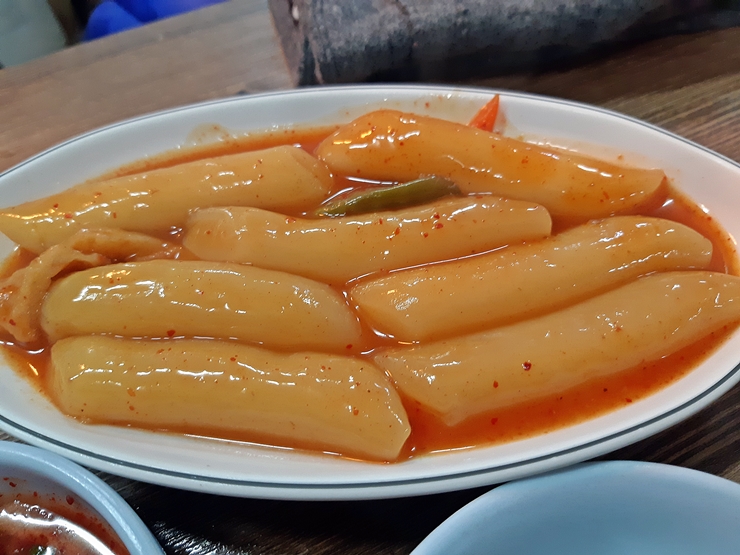 떡볶이. 예전에 왔을 때에는 떡볶이는 주지 않았는데 이 날은 떡볶이도 함께 나왔다. 떡볶이는 시장 등에서 쉽게 맛 볼 수 있는 일반 떡볶이이다.