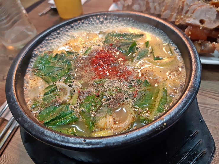 순댓국. 공덕역 족발골목에 있는 집들의 순댓국은 조금씩 맛의 차이가 있다. 마포 유가 궁중족발은 비교적 담백한 맛이 특징이다. 더불어 순대보다는 내장, 고기 등 부속물들이 더 많이 들어있다. 순대는 따로 제공이 되기 때문에 이렇게 순댓국을 만드는 것 같은데 굉장히 훌륭한 조합이 아닐 수 없다. 간이 세지 않아 쉽게 물리지 않는다. 순댓국은 양이 부족하거나 차가워지면 다시 데워달라고 하면 된다. 이 날은 직원이 친절하게도 먼저 따끈한 순댓국으로 바꿔줬다.