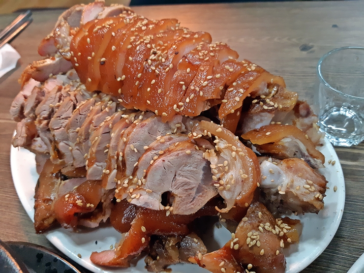 족발(소). 족발집에 왔으면 족발을 먹어야지. 족발은 소 사이즈와 대 사이즈가 있다. 소 사이즈는 뒷다리를 사용하고 대 사이즈는 앞다리를 사용하는데 부위 차이뿐만 아니라 양 차이도 좀 난다. 앞다리가 비교적 쫄깃하고 기름기가 많은데 둘이서 대 사이즈를 시킬 경우 다 먹지 못하는 불상사가 일어날 가능성이 크다. 뒷다리는 기름기가 적긴 하지만 담백한 맛은 앞다리에 비해 뛰어나기 때문에 뒷다리 역시 즐겨 먹는 부위다. 사실 앞다리, 뒷다리가 무슨 상관이냐. 좋은 사람과 좋은 음식을 먹으면 그게 진수성찬이고 극락인 것이다.