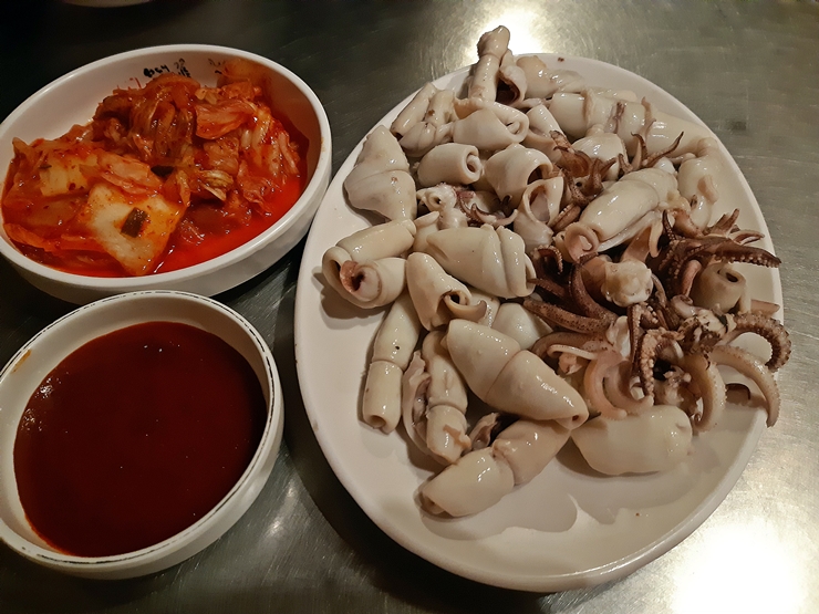 꼴뚜기 데침. 주문 즉시 꼴뚜기를 데쳐준다고 한다. 꼴뚜기의 외모가 나와 얼핏 비슷해서 동질감과 슬픔을 같이 느끼면서 한 입 먹어보니 상당히 신선하다는 느낌을 받았다. 신선한 꼴뚜기는 그냥 먹어도 참 맛있고 초장을 살짝 찍어 먹어도 참 맛있다. 난 초장을 싫어하는지라 주로 그냥 먹었다.