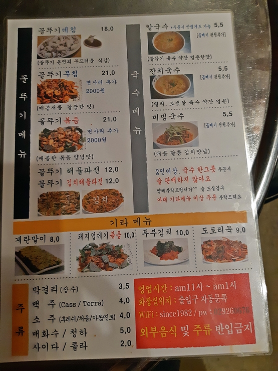 가게 이름에 걸맞게 꼴뚜기 요리와 국수가 메인으로 있고, 그 밖에 계란말이, 돼지껍데기볶음, 두부김치와 도토리 묵도 판매를 하고 있다.