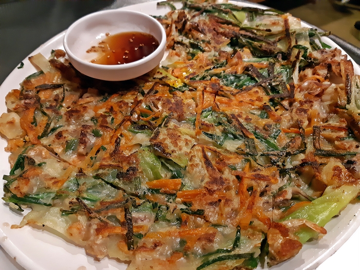 꼴뚜기 해물파전. 일반적인 해물 파전에 오징어 대신 꼴뚜기를 넣은 것이다. 꼴뚜기 함량이 그리 높지 않은 것처럼 보이는데 한 입 먹어보면 꼴뚜기 맛이 은은하게 느껴진다. 크러스트가 굉장히 바삭해서 좋았다.