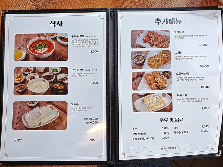 메뉴. 식사로는 순두부 짬뽕, 순두부 백반과 모두부를 판매하고 있고, 꼬막무침, 꼬막전, 오징어 순대와 두부구이도 판매하고 있다. 순두부 짬뽕은 좀 매울 거 같아서 나와 짝꿍은 순두부 백반을 주문했다. 다른 것도 먹을까 잠시 고민을 하다가 정량만 먹기로 굳은 각오를 했기 때문에 꾹 참았다.