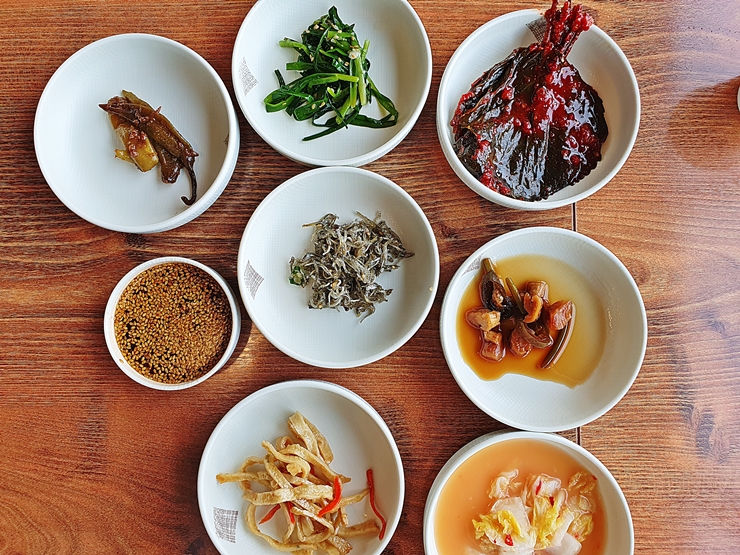 빠르게 나온 반찬. 고추 장아찌, 나물, 콩잎, 간장, 멸치, 마늘쫑, 어묵과 물김치가 나온다. 고기 반찬이 없는 것이 심히 아쉽지만 이런 반찬은 참으로 정겹기 그지 없다. 깻잎이 아닌 콩잎이 나오는 것이 특이한데, 콩잎은 강원도에서 즐겨 먹는 것이라고 한다.