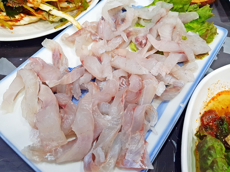 돌돔 세꼬시. 양이 적어 보이긴 하지만 두 명이 먹기에 충분한 양이다. 참바다횟집은 세꼬시는 활어를 사용하고, 회는 선어를 사용한다. 활어는 선어에 비해 감칠맛이 부족하기 때문에 온전한 맛을 느끼기에는 부족한 것이 사실이다. 하지만 집중해서 꼭꼭 열심히 씹어 먹으면 은은하게나마 그 맛을 느낄 수 있다.