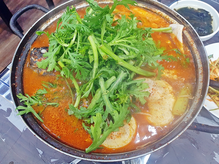 마무리로 즐긴 서더리 매운탕. 큼직한 알이 엄청나게 많이 들어있다. 광어, 우럭과 돔 등 다양한 생선 자투리를 사용해서 만들었는데 오래 끓여야 그 진정한 맛을 느낄 수 있지. 그래서 계속 물을 보충하면서 끓여 먹었다. 사진에는 없지만 라면 사리를 하나 추가해서 먹었는데 진짜 진국이었다. 익산에서 맛있는 회와 더불어 다양한 스끼다시를 먹고 싶다면 한 번 방문할 것을 추천하는 곳이다.