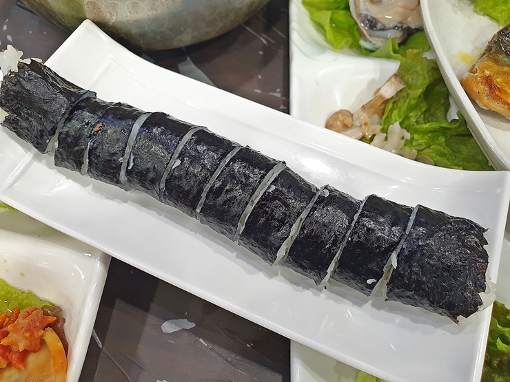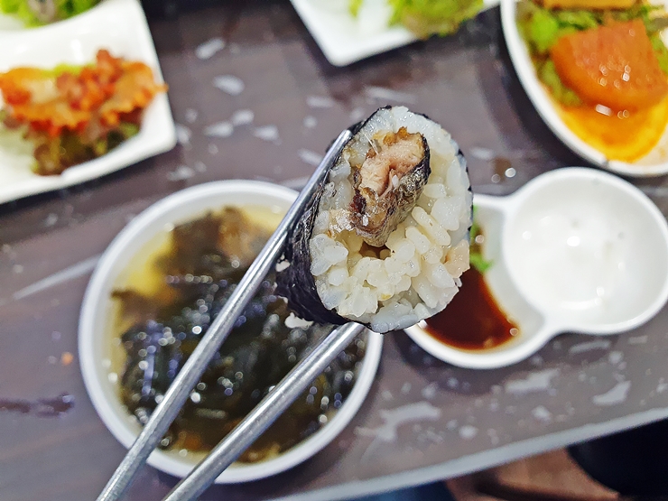 꽁치김밥. 제주에서 먹었던 것을 이런 내륙지방에서 먹을 줄은 몰랐네. 꽁치 등뼈를 제거한 후 한 마리를 통으로 넣어 만든 단순한 김밥이다. 이 단순한 김밥이 참 중독적인 맛을 낸다. 제주에서 먹었던 그 맛을 생각하며 부디 맛이 똑같기를 기대했다.