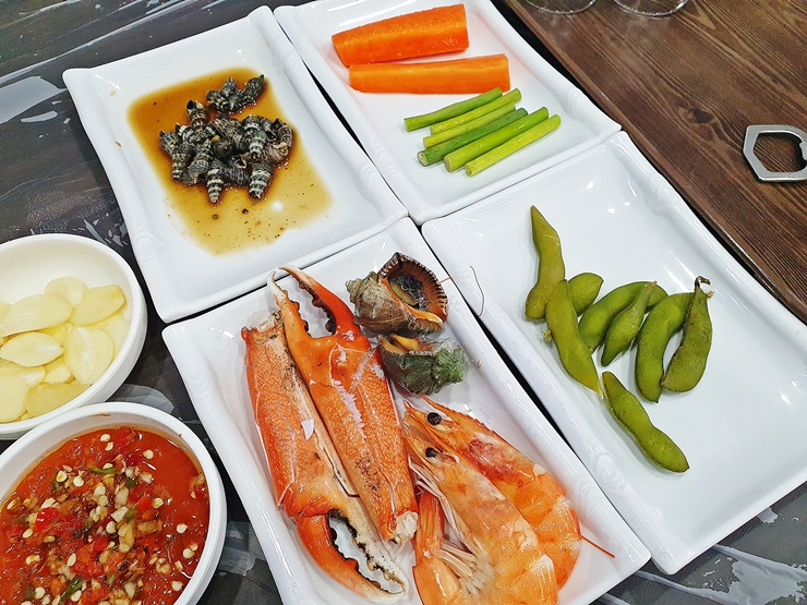 가장 먼저 나온 풋콩, 당근, 마늘쫑, 갯고둥, 새우 등이 나온다. 평소 같았으면 이 모든 것이 소중한 술안주라 생각하고 빠짐 없이 먹었겠지만, 참바다횟집은 다양한 스끼다시가 나오기 때문에 마늘쫑과 풋콩만 먹은 후 다른 것은 사진만 찍었다. 한정된 위장 용량을 가지고 있기 때문에 언제나 선택과 집중은 필수적이다.