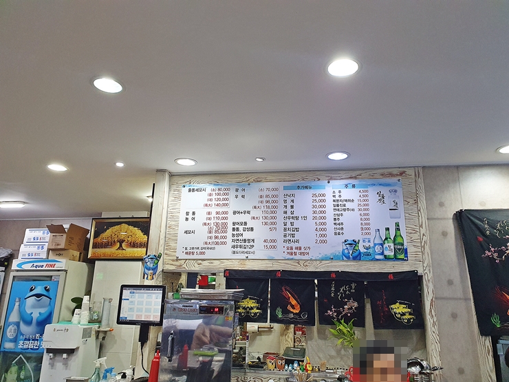 메뉴. 줄돔이라고도 불리는 돌돔 세꼬시와 더불어 참돔, 농어, 우럭/고아어 세꼬시, 광어, 우럭 회 등을 판매하고 있다. 단품 메뉴로 산낙지, 멍게, 개불, 해삼, 우럭탕, 알밥, 꽁치김밥 등도 판매를 하고 있다. 꽁치김밥은 제주에서 먹어봤는데 그 맛이 참 인상 깊었다. 소주와 맥주가 4,500원인 것이 참 마음에 들었다. 처음 대학에 입학했을 때 소주가 2,000원에서 2,500원으로 올랐을 때였는데, 그때를 생각하면 격세지감이 아닐 수 없다. 우리는 이왕 방문한 거 맛있게 먹기 위해서 돌돔 세꼬시를 주문했다.