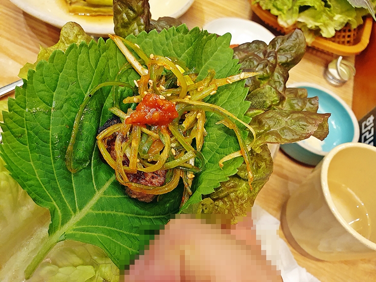 짝궁이 함께 하지 않았지만, 채소를 많이 먹으라는 말을 항상 하기 때문에 채소도 이렇게 열심히 먹도록 한다. 내가 좋아하는 상추, 깻잎과 파무침을 넣어 먹는다. 거기에 살짝 올린 쌈장은 화룡점정이다. 역시 고기는 그냥 먹어도 맛있고 이렇게 쌈으로 먹어도 맛있다.