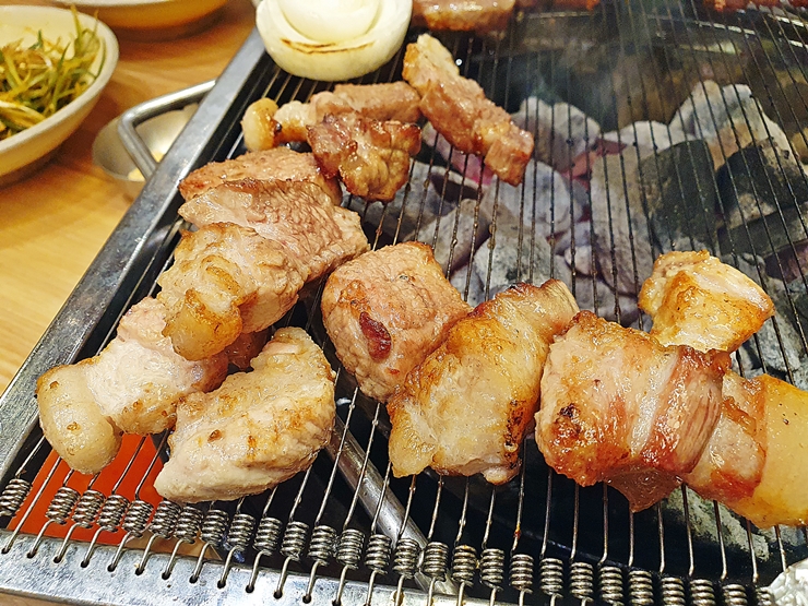 적당한 타이밍에 고기를 먹기 좋은 사이즈로 잘라준다. 지금 봐도 참으로 잘 굽고 있구나. 예전에는 돼지 고기에 기생충이 많아서 바싹 구워 먹어야 한다고 했지만, 요새는 기생충이 없기 때문에 소고기처럼 적당하게 구워 먹어도 된다.