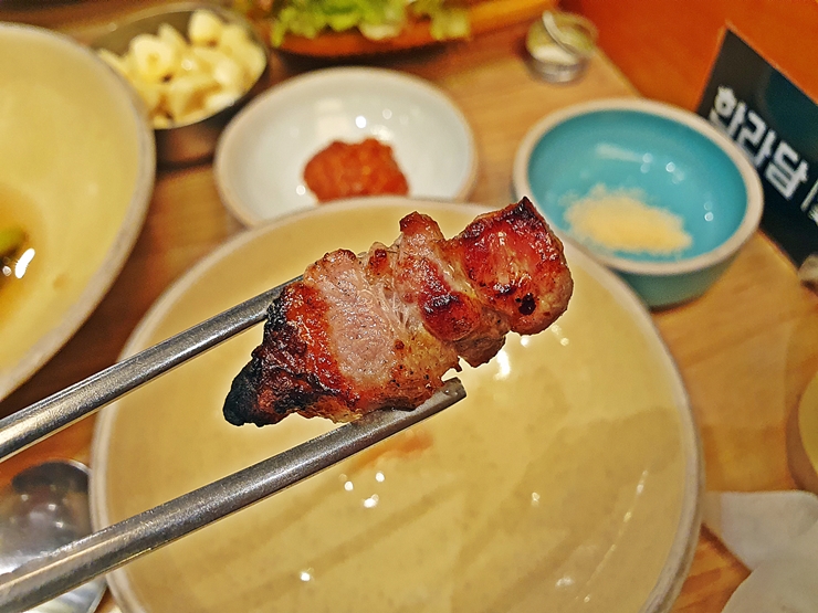 우리가 주문한 것은 제주 근고기. 삼겹살, 목살, 가브리살과 더불어 돼지 껍데기가 나온다. 요새 제주에서 지방 함량이 높은 돼지 고기를 제공해서 논란이 되었는데, 그런 면에서 한라담의 삼겹살은 합격점이다. 과하지도 않고 부족하지도 않게 지방이 잘 껴있다. 돼지 지방은 정성스럽게 구우면 고소한 맛을 느낄 수 있다.