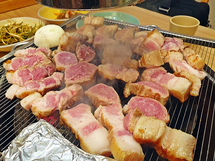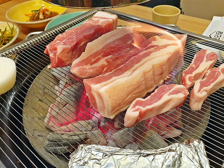 짠. 다 익었다. 참으로 잘 구워졌구나. 소고기를 먹을 때는 안심→등심 순서로 지방이 적은 것부터 먹으라고 하지만, 돼지고기는 기본적으로 지방이 많기 때문에 어느 부위를 먼저 먹어도 크게 상관 없다. 그냥 본인이 먹고 싶은 부위를 먼저 먹는 것이 최고다.