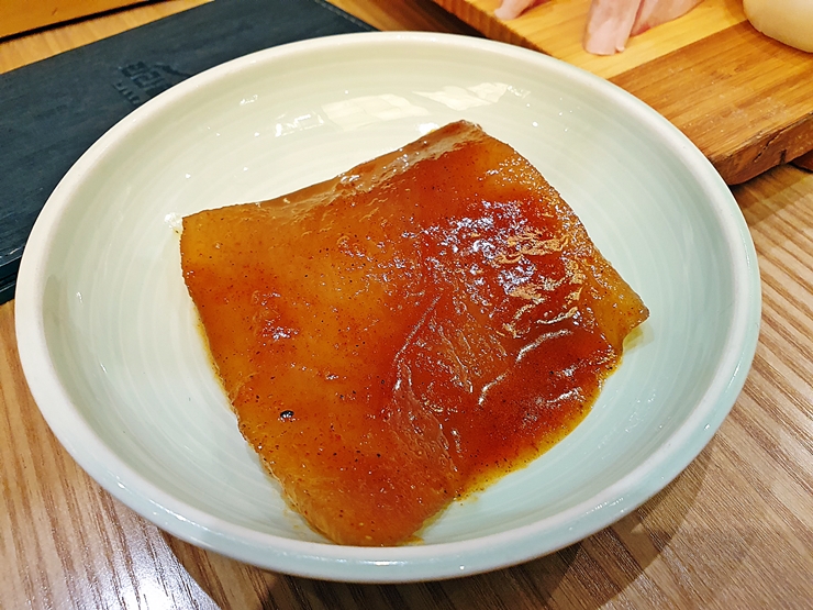 돼지 껍데기. 껍데기는 한 번 삶아서 나온다. 짭짤하면서 달달한 소스로 양념이 되어있는 것이 특징이다. 껍데기는 고기를 다 먹은 후 후식 개념으로 먹으면 된다. 고기를 먹은 후 다시 고기로 입가심을 할 수 있는 한라담. 참으로 좋은 곳이 아닐 수 없다.