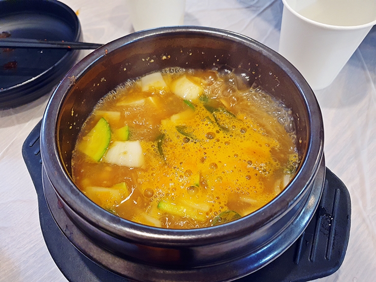 기본으로 나오는 된장찌개. 요새는 이런 된장찌개를 제공하는 곳이 많이 없는데, 이렇게 기본으로 나오면 참으로 반갑기 그지 없다. 많지 않은 양이지만 두 명이 먹기에 충분한 양이다. 고기는 들어 있지 않고 호박, 양파와 두부가 실하게 들어있다. 고기는 구워 먹으면 되니까, 찌개에 고기가 없어도 좋다.