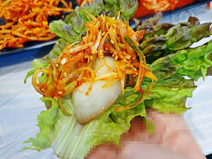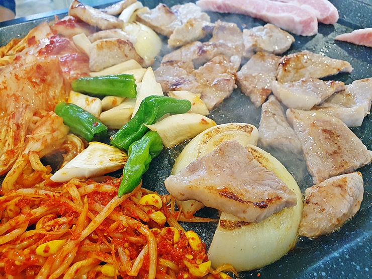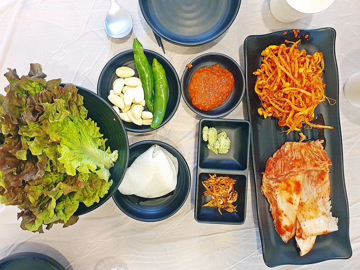 기본 반찬. 상추, 마늘, 고추, 쌈무, 쌈장, 와사비, 새우젓, 콩나물과 김치가 나온다. 콩나물과 김치는 고기를 구울 때 함께 구우면 좋다. 그냥 먹어도 좋지만 구워 먹으면 그 맛이 배가 된다. 프로메테우스가 불을 선물한 이유가 다 있다.