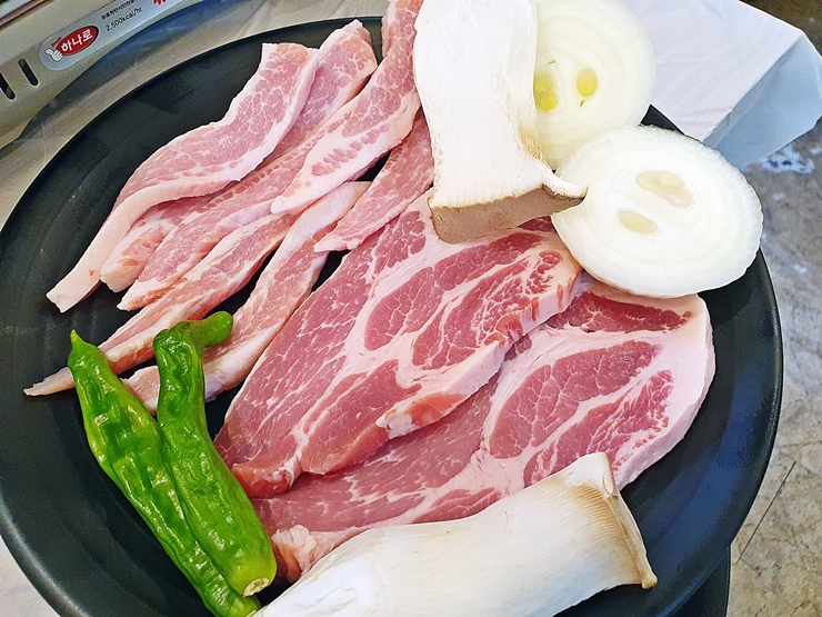 우리가 주문한 목살과 항정살. 고기를 주문하면 새송이 버섯, 양파와 고추를 함께 제공한다. 고기만 그냥 먹어도 맛이 좋지만 이렇게 양파와 새송이 버섯을 함께 먹으면 그 맛이 더욱 좋아진다. 특히 돼지 기름을 머금어 잘 익은 양파는 그 맛이 참 각별하다. 납대울집은 고기를 구워주는데 고기 굽는 솜씨가 예사롭지 않다.