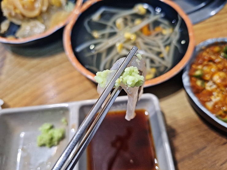 먼저 도다리의 맛을 느껴보기 위해서 와사비와 간장으로만 먹어봤다. 음. 와사비를 너무 많이 발랐다. 그래서 사진을 찍은 후 와사비를 조금 덜어 먹었다. 활어 회이기 때문에 도다리 특유의 고소한 맛을 잘 느낄 수 없었지만, 그래도 꼭꼭 오래 씹으면서 신중히 맛을 음미하다 보니 어느 정도는 맛을 느낄 수 있었다.