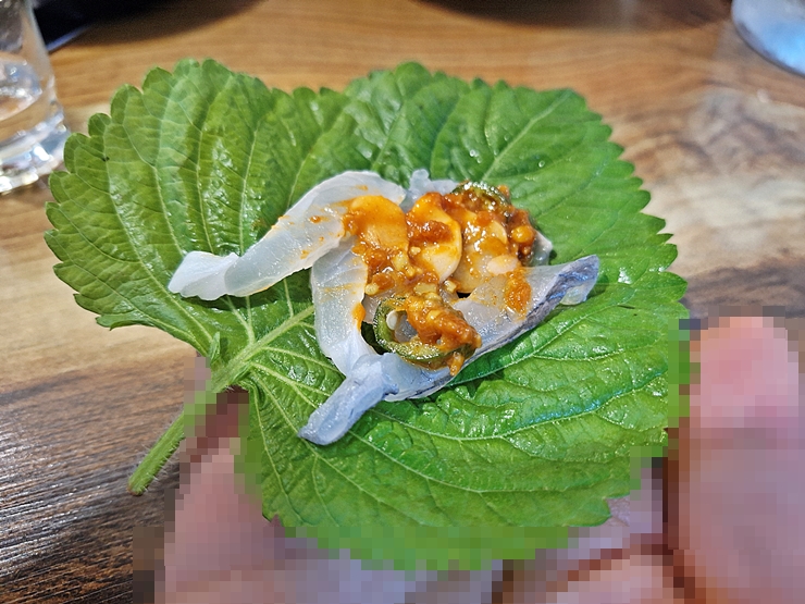 이런 세꼬시는 호쾌하게 많은 양을 한 번에 싸서 먹는 법이 더 맛있기 마련이지. 그래서 세꼬시 여러 점과 함께 쌈장을 넣고 한 입에 크게 넣어 먹었다. 그리고 소주를 한 잔 털어 넣으니 참 좋았다. 선어 회에서는 이런 흥취를 느낄 수 없지. 역시 활어 회도 활어 회 특유의 매력이 있다.